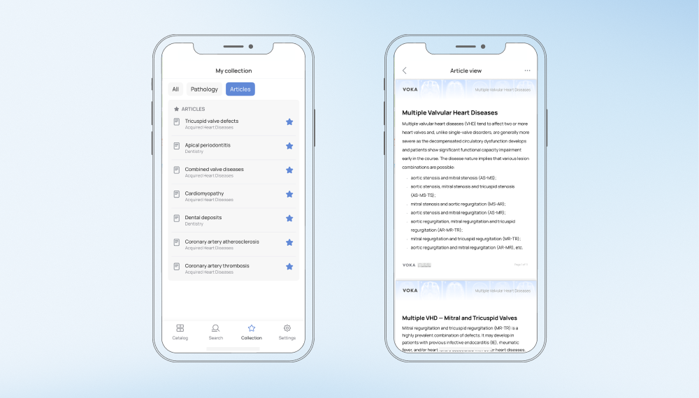 La sección ‘Artículos’ de la aplicación VOKA 3D Anatomía y Patología es perfecta para una consulta rápida. Si necesita una investigación más profunda, también puede utilizar VOKA Wiki. Este recurso incluye artículos de expertos apoyados por contenidos visuales, cuestionarios interactivos, un glosario médico y resúmenes generados por IA.