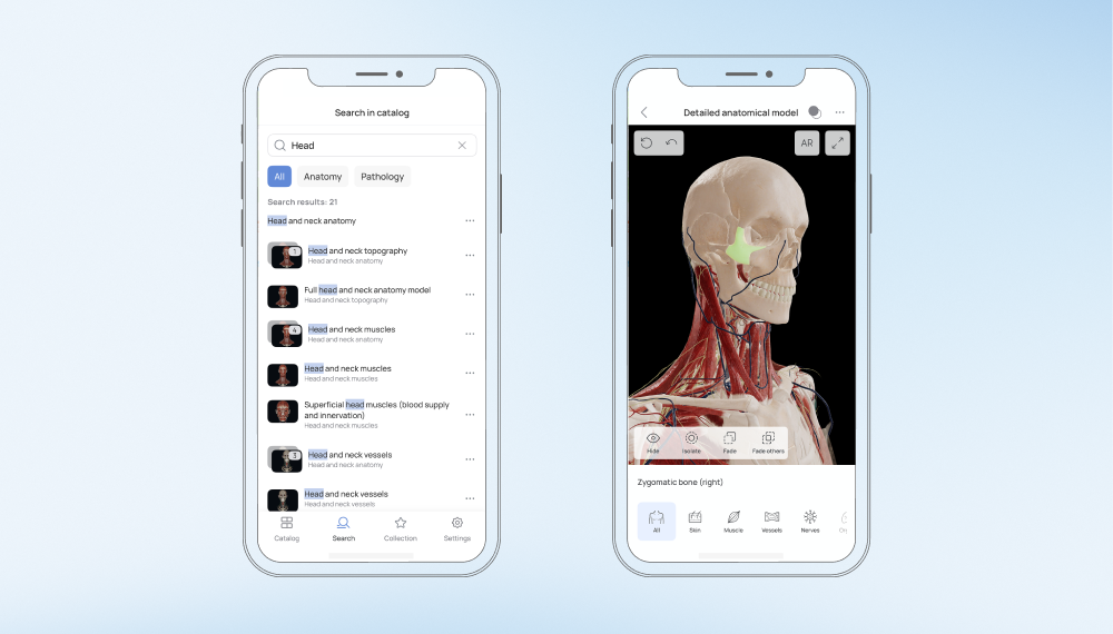El núcleo de nuestra solución son los modelos 3D de alta fidelidad de la anatomía normal y las condiciones patológicas. Para garantizar una precisión absoluta, cada modelo se desarrolla a partir de escáneres de IRM/TC, referencias histológicas y manuales clínicos autorizados. Además, el catálogo se actualiza periódicamente para mantenerlo en estricta consonancia con la evolución de las normas clínicas mundiales.