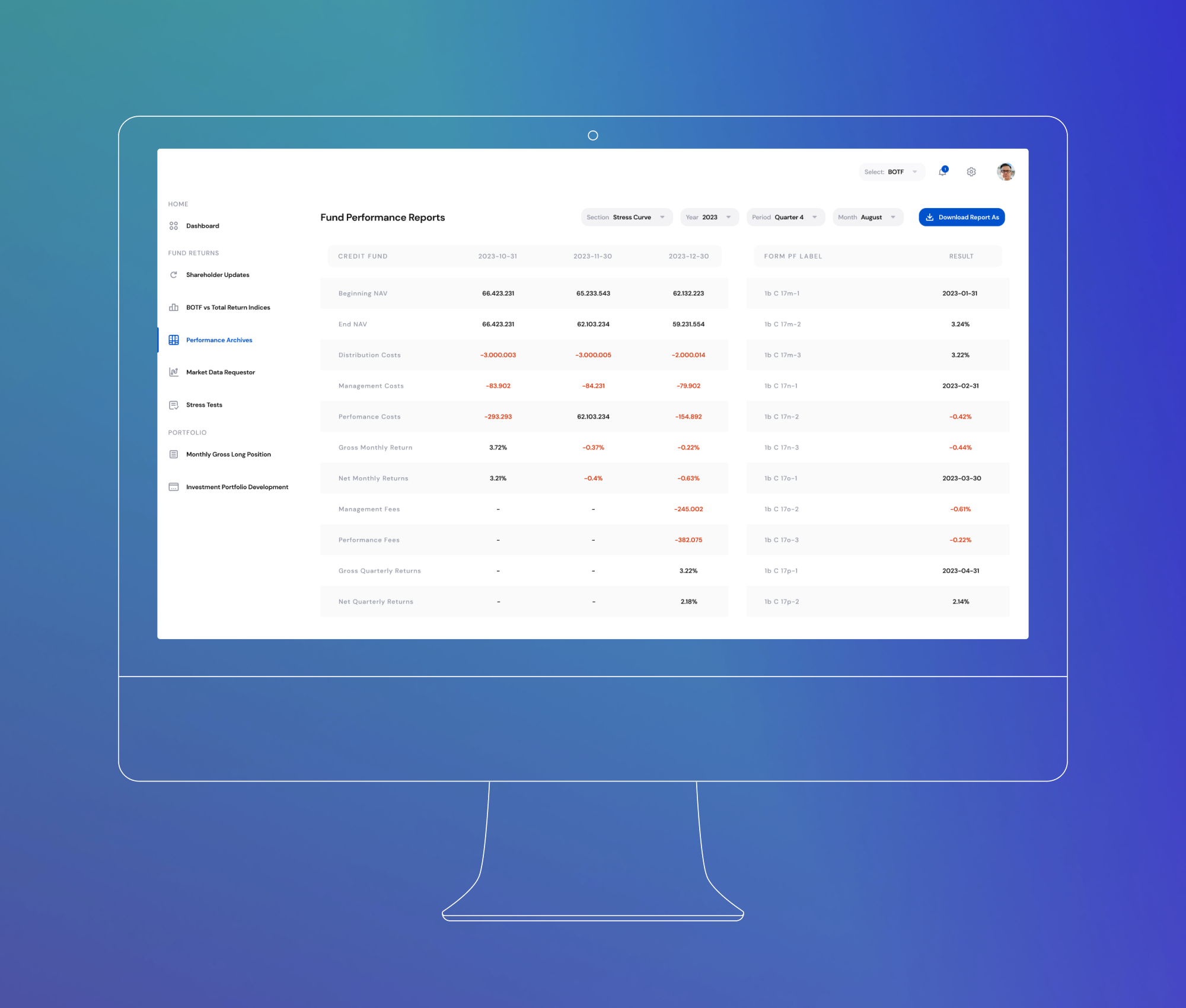 De finansiella rapporterna täcker en rad fonder och kan genereras kvartalsvis eller månadsvis. Klienten kan anpassa rapportmallar enligt deras specifikationer och bekvämt exportera dem i olika filformat.